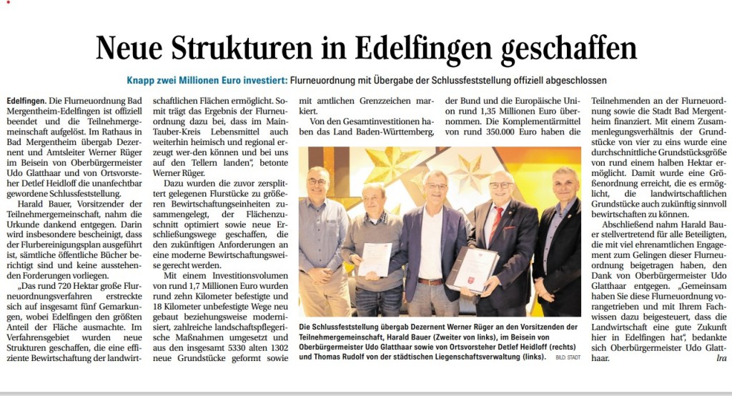 Durch das erfolgte Flurbereinigungsverfahren „Bad Mergentheim-Edelfingen“ (Regelverfahren nach § 1 FlurbG) müssen die bisherigen Schätzungsergebnisse überprüft und an die neuen Flurstücksgrenzen angeglichen werden. Dazu wird eine Nachschätzung nach § 11 des Bodenschätzungsgesetzes durchgeführt.